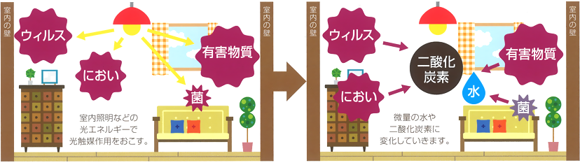 ■防汚・抗菌・脱臭・空気清浄 光触媒に高いエネルギーを持つ光を照射すると、触媒反応によって空気中の酸素と水分からOHラジカル(活性酸素)を生成し、強い酸化力が発生します。 その酸化力によって有害な化学物質や環境ホルモン、ウイルスなどの有機物を分解・無害化することができます。
