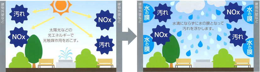 建物の外壁に光触媒をコーティングした場合、表面に水がかかると水滴にならずに水の膜になります(防雲)。酸化チタンは汚れよりも水との相性が良いため、 汚れの下に水が潜り込み、汚れを浮き上がらせます。雨などが降った場合は自然に汚れを洗い流します(セルフクリーニング)