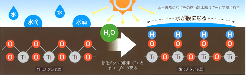 酸化チタンは、光を受けることで空気中の水分と反応し、表面に親水基(-OH)を作ります。 この親水基は、水との接触角を限りなく0°に近づけ、表面をほとんど水を弾かない状態にします。